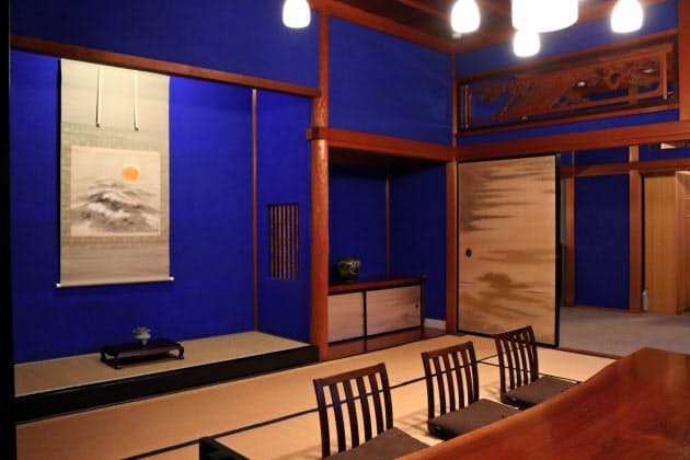 犀川沿いの台地に位置する辻家庭園(金沢市)の母屋に入ると、一面が群青色の和室に驚く。青い宝石ラピスラズリをふんだんに壁の塗料に使った「群青の間」だ。光が当たると小さくきらきら輝き、宝石であることを再認識させられる。