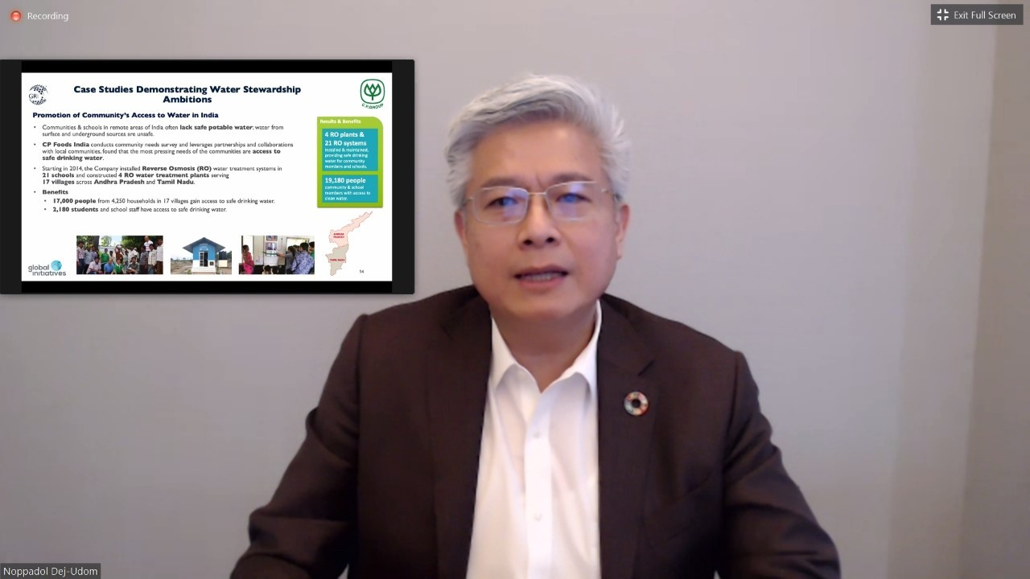 ในโอกาสนี้ นายนพปฎล กล่าวในหัวข้อ Sharing our Sustainability Journey: A Story of C.P. Group’s Water Stewardship ว่าด้วยการทำงานตามเป้าหมายการพัฒนาอย่างยั่งยืนของเครือฯ ซึ่งมีแผนงานและกลยุทธ์ที่ชัดเจน รวมถึงการเปิดเผยข้อมูลด้านความยั่งยืนตามมาตรฐาน GRI ดังที่ปรากฎในรายงานความยั่งยืนประจำปีของเครือฯ และได้ยกตัวอย่างเรื่องการบริหารจัดการน้ำเป็นกรณีศึกษา ซึ่งเน้นการลดปริมาณการใช้น้ำ ลดการปล่อยน้ำกลับสู่สิ่งแวดล้อม ตามหลักการจัดการน้ำแบบหมุนเวียนผ่าน 3 โครงการ ประกอบด้วย 1.การจัดการน้ำแบบหมุนเวียนในฟาร์มเลี้ยงกุ้ง 2. การผลิตก๊าซชีวภาพจากน้ำเสียในฟาร์มสุกรมาเป็นพลังงานทดแทน 3. การส่งเสริมการเข้าถึงแหล่งน้ำของชุมชนในอินเดีย โดยโครงการเหล่านี้อยู่ภายใต้การดำเนินงานของบริษัท เจริญโภคภัณฑ์อาหาร จำกัด (มหาชน) หรือ ซีพีเอฟ ซึ่งเป็นบริษัทในเครือฯ ด้านเกษตรและอาหาร ผ่านการนำเทคโนโลยีมาประยุกต์ใช้เพื่อรักษาสิ่งแวดล้อม และแบ่งปันองค์ความรู้ในระบบการผลิต เพื่อช่วยให้ผู้มีส่วนได้ส่วนเสียทั้งหมดมีส่วนร่วม เป็นตัวอย่างของการสร้างเศรษฐกิจหมุนเวียน (Circular Economy)
