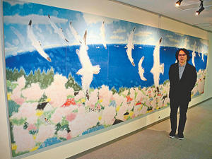 日本画家斎正機(さいまさき)さん(54)=福島市出身、横浜市在住=が古里復興の願いを込めた大作「ふくしま物語―桃源郷59の願い」(縦1.8メートル、横6メートル)を制作した。