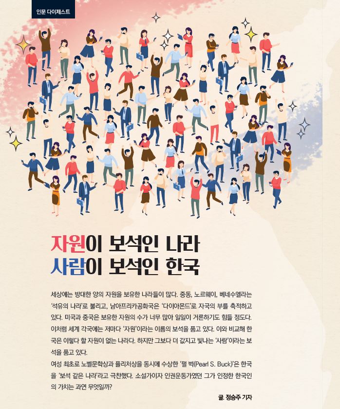 인간의 내면을 깊은 통찰력으로 바라본 작가, 펄 벅! 그가 발견한 한국의 보석은 바로 국민들의 훌륭한 인성이었다. 국민 모두가 보석인 나라, 그 고귀한 보석들은 과거부터 지금까지 잘 다듬어지고 있으며, 앞으로 더욱 빛나는 가치를 발휘할 것이다.