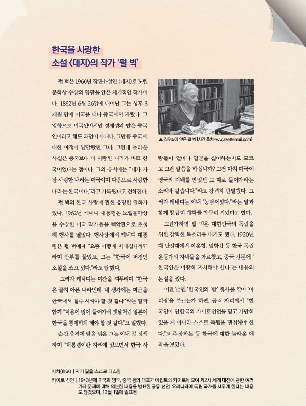 그런가하면 펄 벅은 대한민국의 독립을 위한 강력한 목소리를 내기도 했다. 1920년대 난징대에서 여운형, 엄항섭 등 한국 독립운동가의 자녀들을 가르쳤고, 중국 신문에 ‘한국인은 마땅히 자치해야 한다.’는 내용의 논설을 썼다.