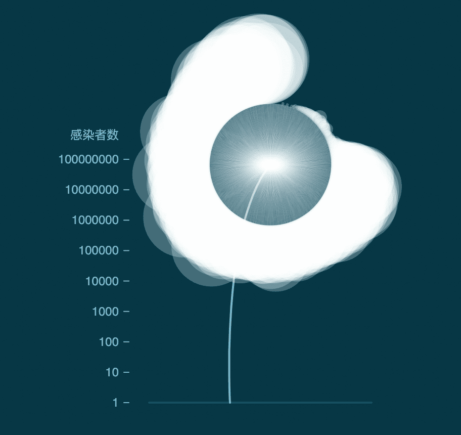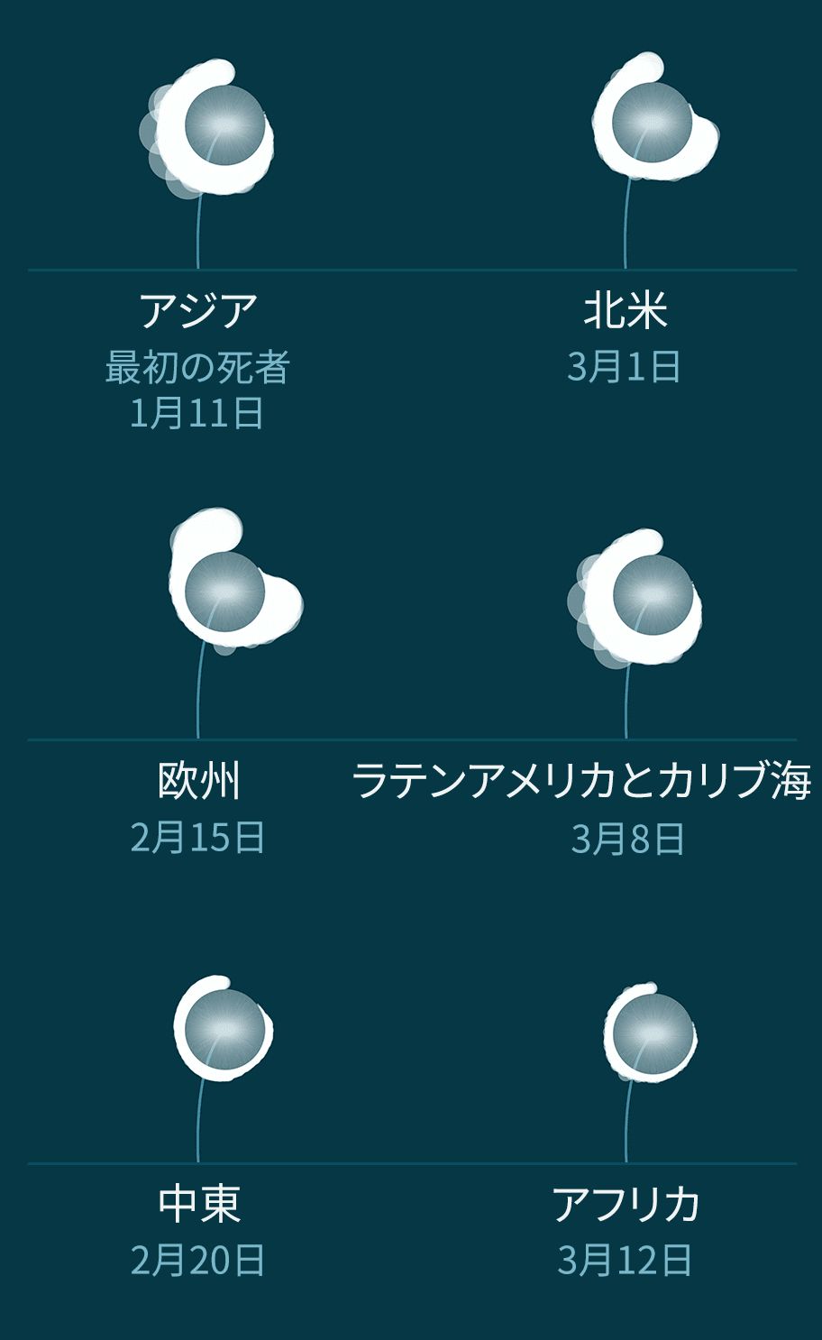 大陸ごとに花を描くことで、アウトブレイクの中心地が世界を移動していった様子を示しています。その間に世界全体の死者数がどう増え続けたかも見ることができます。