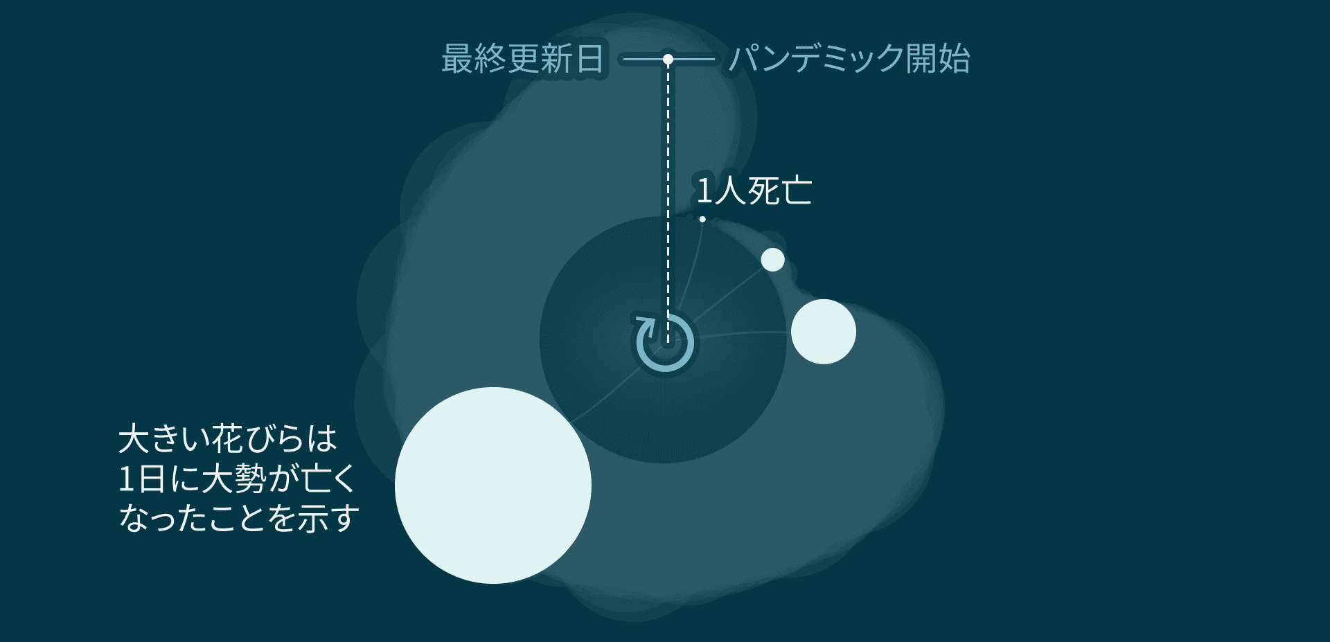 最新データを表す花びらは、残念なことに、これまでで最大になっています。世界中の1日の死者数が過去最多になっているからです。