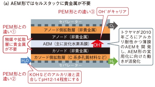 AEM形の最大のメリットは、セルスタックの触媒やガス拡散層に貴金属を使わなくてもよいことである(図1)。これにより、材料費の大幅削減が見込める。