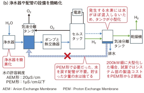 また、AEM形には、補器をPEM形より簡略化できるメリットもある。例えば、産業技術総合研究所 エネルギー・環境領域 省エネルギー研究部門 熱流体システムグループ 研究グループ長の伊藤博氏が開発したAEM形水電解装置は、浄水器と水の配管をPEM形より簡素にした。同氏は、200kW級に大型化した場合、PEM形から約2割製造コストを下げられると試算した。