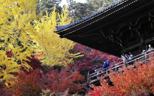 晩秋の低い日差しに照らされた千年超の古刹は、赤や黄色の紅葉と参拝客に囲まれて華やいだ。兵庫県姫路市の書写山円教寺。南向きの崖にせり出すように建てられた舞台造りの摩尼殿には大勢の人が訪れ、秋色に染まった山上の風景を満喫している。