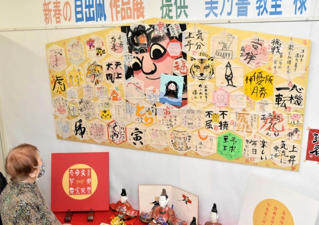 今年は4~93歳が出展。横180センチ、縦90センチの絵馬形の背景に、たこの形に切り抜いた約50点を貼り付けた。獲物を見つけたかのような鋭い眼光を放つ虎は迫力満点。かわいらしい笑顔の虎は、ほっこりさせる。「阪神優勝」とお気に入りのプロ野球チームへの応援や「さかあがりができますように」など、それぞれの思いが並ぶ。