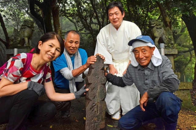 今年2月、行方が分からない江戸期の町石を探そうと、神社から約900メートル下ったあたりを探していたところ、地中から一部が飛び出した状態の町石があった。写真を撮って奥本宮司に確認し、建武年間の町石と判明した。「変わった形の石だと思って掘り返して驚いた」と岡本さん。入口さんは「そんな貴重なものと思わなかった」という。