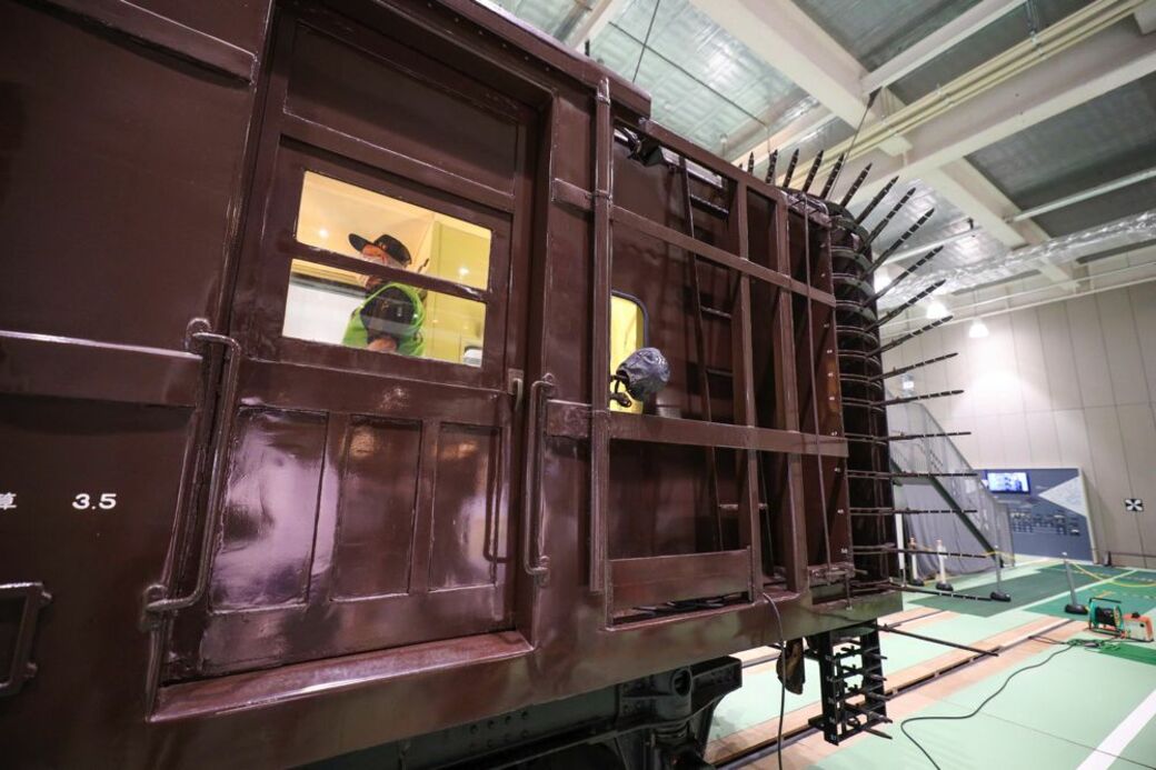 リニア・鉄道館に展示されているオヤ31 12はスハ32 426を改造した車両。館内通路側の車端部の矢羽根を展開している(筆者撮影)