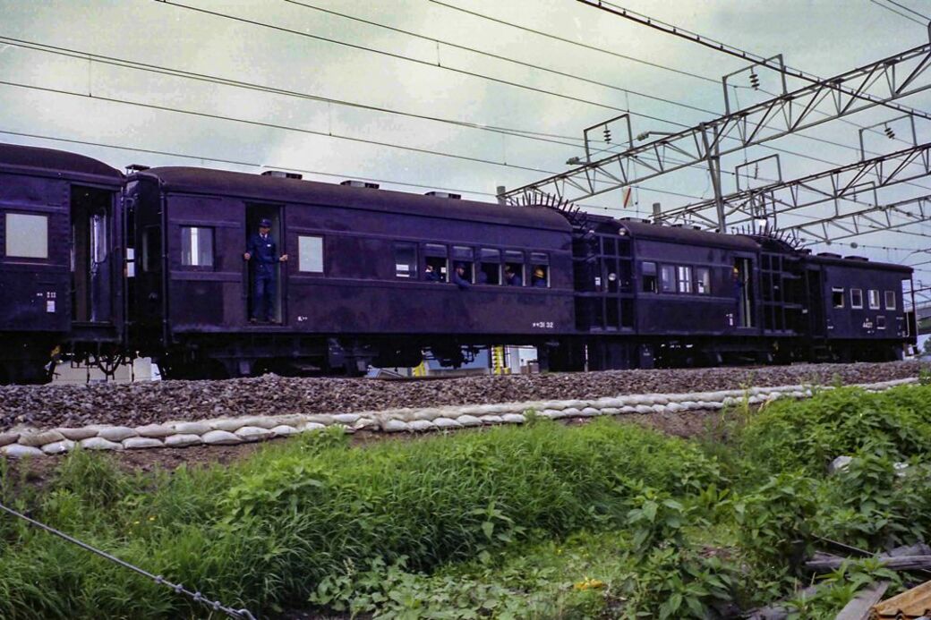1980年の千歳線・室蘭本線電化の際に運転されたオイラン列車。オヤ31 32は車端部と台車中心から6.9mの2カ所に矢羽根を設置。これはオヤ31 31・32だけの特徴で、他車は矢羽根が3カ所にある(筆者撮影)