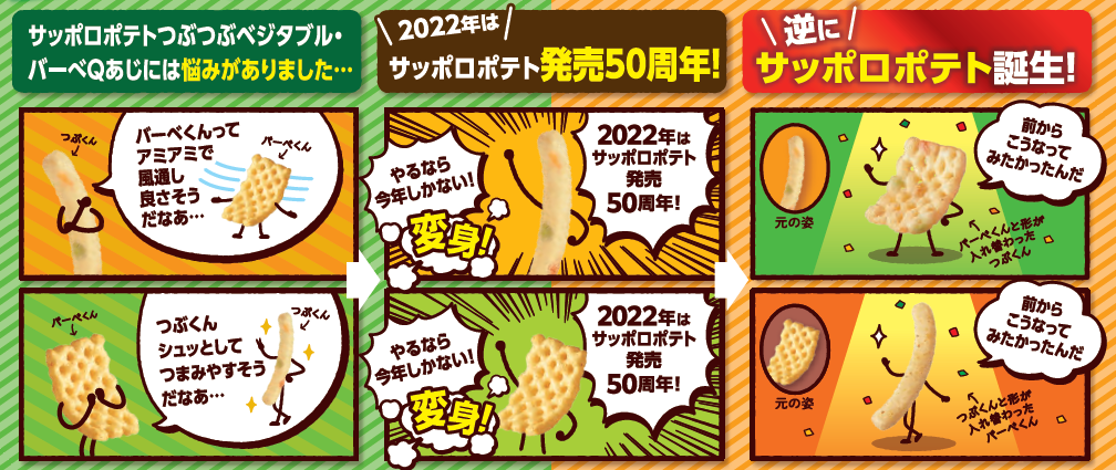 1972年に発売した「サッポロポテト」は、お子様から大人まで幅広い層のお客様に、長年親しんでいただいているロングセラーブランドです。発売50周年を記念し、じゃがいもと7種の野菜のやさしい味わいが楽しめる「サッポロポテト つぶつぶベジタブル」と、チキン&ビーフをじっくり煮込んだスープを練り込み肉の旨味がクセになる「サッポロポテト バーベQあじ」の2品の形を入れ替えた「逆にサッポロポテト」を発売します。2品の形を入れ替えて発売するのは「サッポロポテト」史上初めてのことです。50周年の特別感を楽しんでいただくとともに、2つの「サッポロポテト」をあらためてお客様に手に取っていただきたいという思いから数量限定で発売いたします。