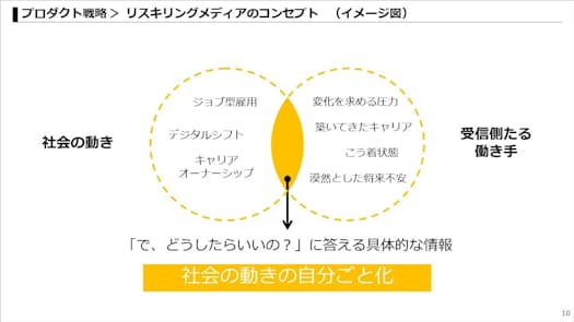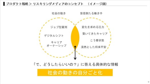 今市 メディアのコンセプトを図解で説明しているスライドです。円を2つ重ねて、「社会の動き」と「受信側たる働き手」が重なるところから「社会の動きの自分ごと化」というコンセプトが導かれていることを示しています。